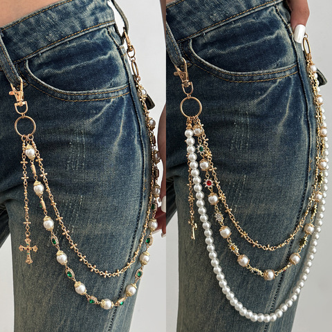 ファッション真珠ラウンドアクリルクロスパンツチェーン女性用流行レディースジーンズチェーンアクセサリー