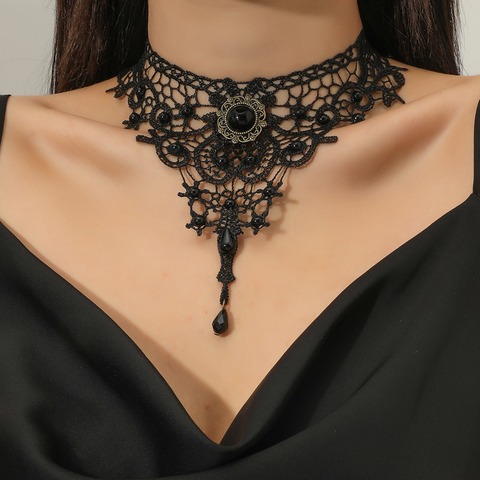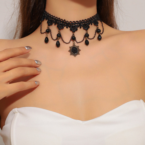 Moda oscuro Retro Halloween encaje flecos negro colgante clavícula cadena